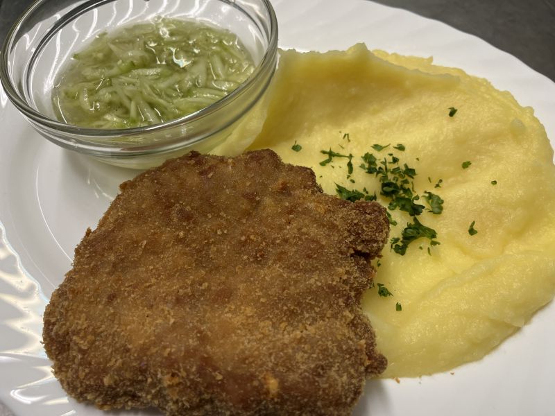 Holandský řízek s bramborovou kaší a okurkovým salátem [ 1, 3, 6, 7, 8, 11, 13]