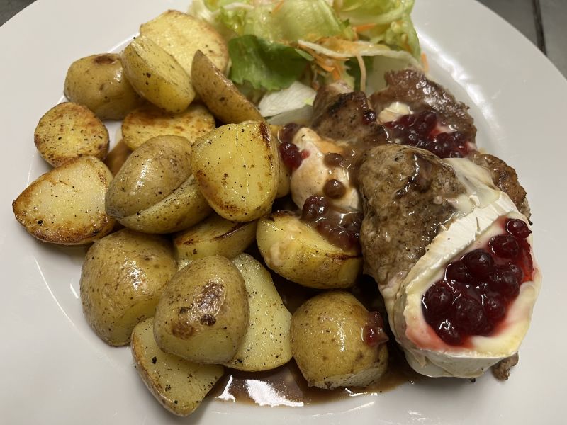 Kuřecí prso gratinované hermelínem a brusinkami, bramborová kaše