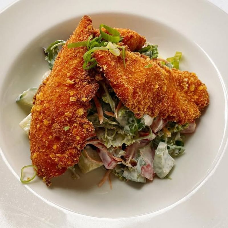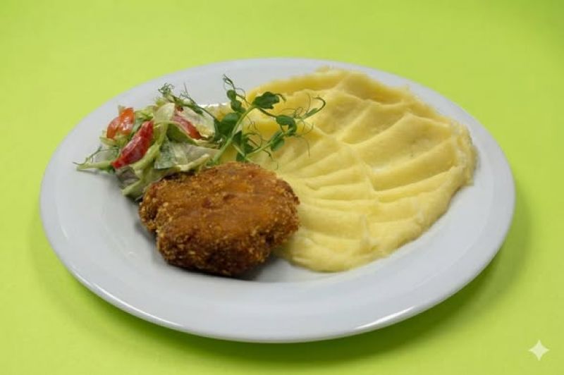 Smažené řízkové duo bramborová kaše, okurkový salát