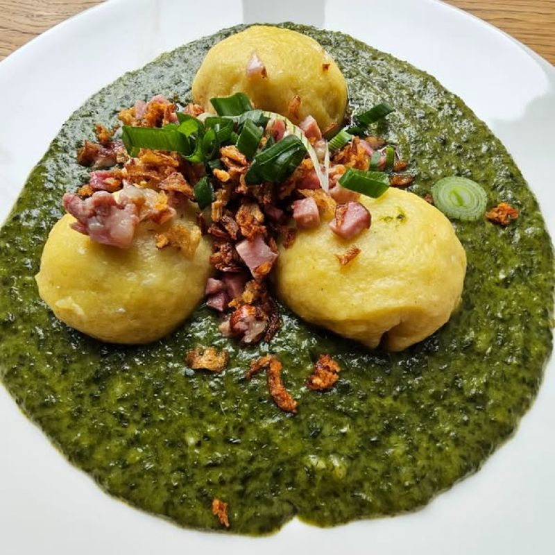 Plněné bramborové knedlíky uzeným masem, špenát (dušené zelí)