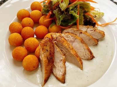 Kuřecí nudličky v omáčce tří sýrů, krokety
