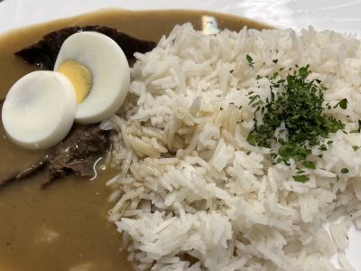 Vepřový ptáček s dušenou rýží, okurek (1,3,,12)