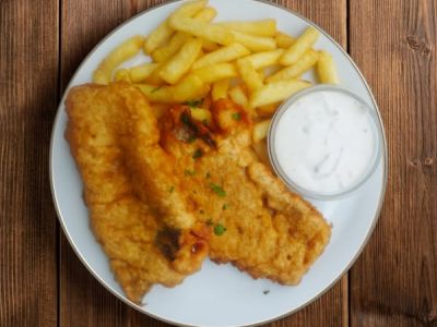 Smažený kuřecí řízek v cornflakes, julienne hranolky, koktejlový dresink