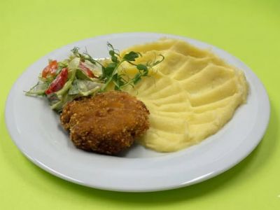 Telecí karbenátek v bylinkové strouhance,bramborová kaše,mrkvový salátek (1,3,7)