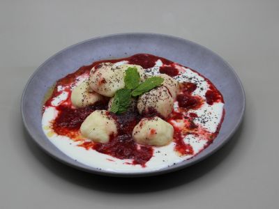 Plněné kynuté domácí knedlíky s borůvkami, tvarohová omáčka, máslo, máta