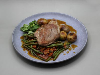 Nabídka týdne: Steak z vepřové krkovičky připravovaný metodou Souise - Vide se zelenými fazolkami na česneku a pečenou bramborou plněnou křenovým dipem