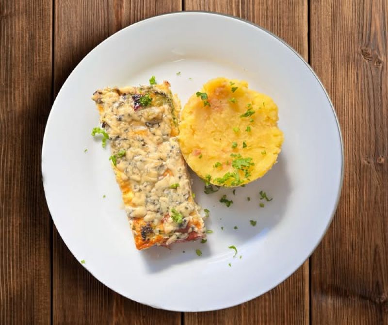 Kuřecí steak se sýrovou omáčkou a pečenými brambory [ 1, 7]