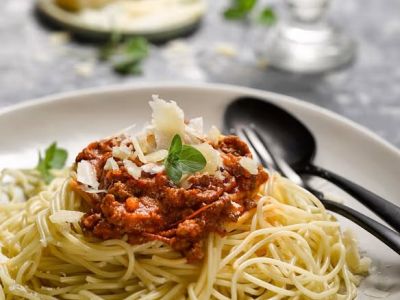 Špagety s boloňským ragú, strouhaný sýr