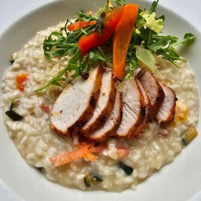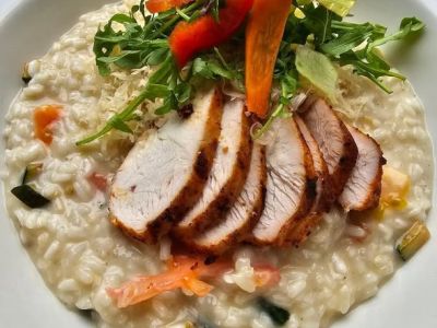 Risotto s hráškovým pestem, cukrovým hráškem a uzeným lososem [4, 7, 12]