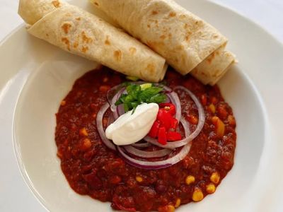 350 g Quesadilla s kuřecím masem, gouda, hranolky, chilli majóneza