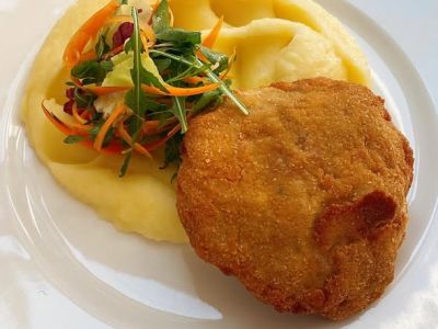 6. 200g Vídeňský řízek z vepřové panenky pomalu smažený na sádle, bramborový salát/vařený brambor