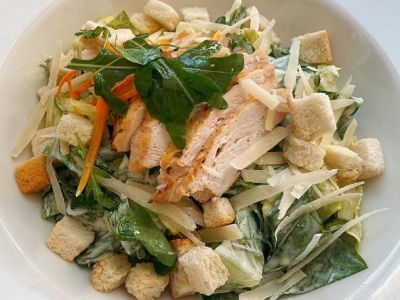 Zeleninový salát s kousky kuřecích prsíček a bylinkovým dresinkem