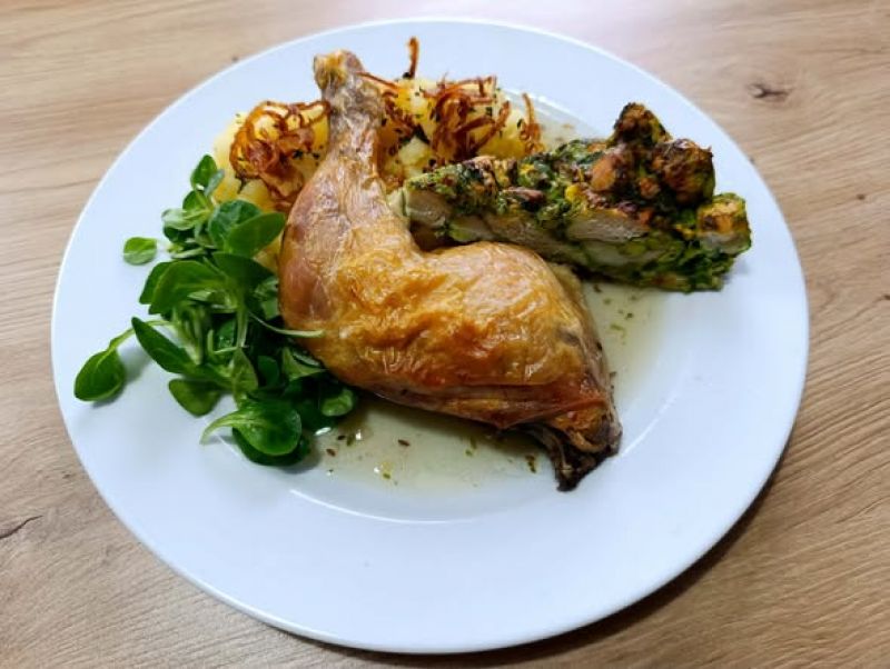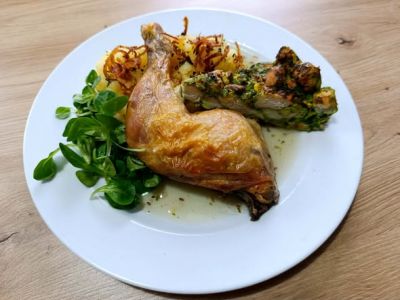 Pečené stehno z králíka na zelenině s mandlovou nádivkou 1, 7, 10