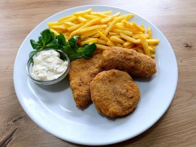 Smažený sýr se šunkou, hranolky, tatarka