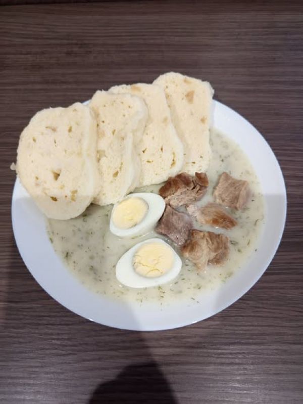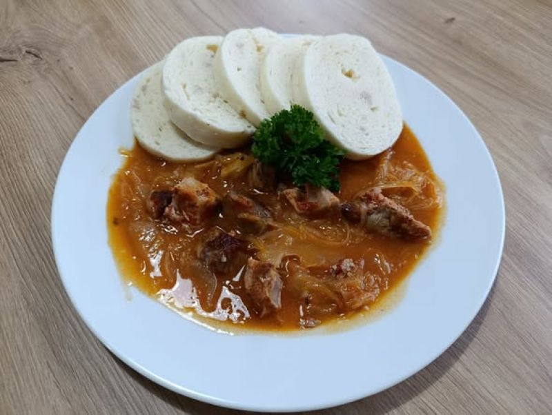 Zabijačkový guláš, náš houskový knedlík, cibule