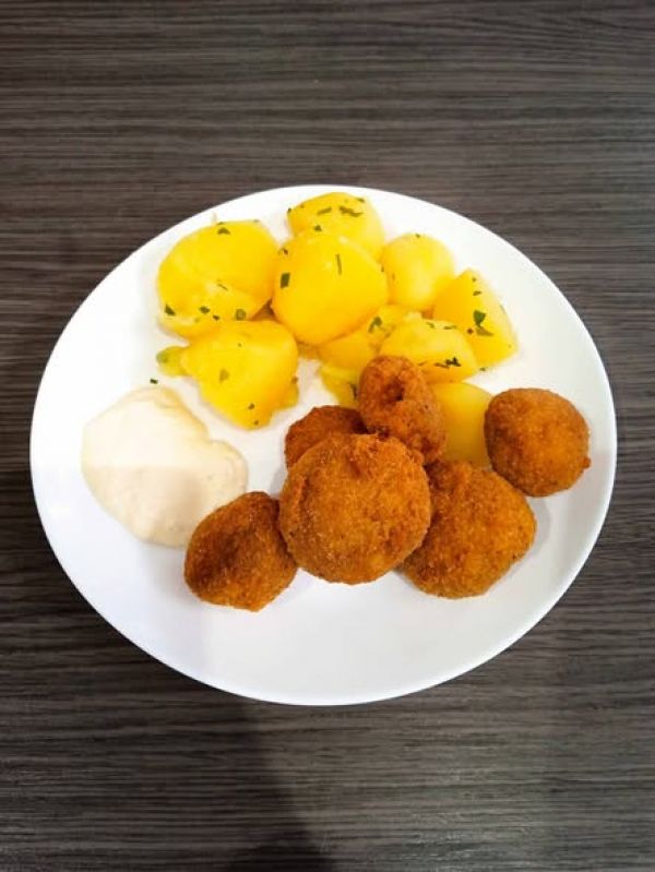 Smažený eidamský sýr se šunkou, vařený brambor s petrželkou, naše tatarská omáčka