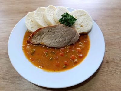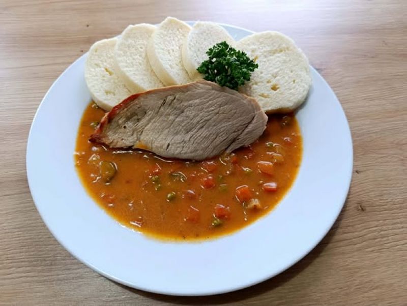 libová vepřová krkovice s muškátovým velouté a karlovarským knedlíkem