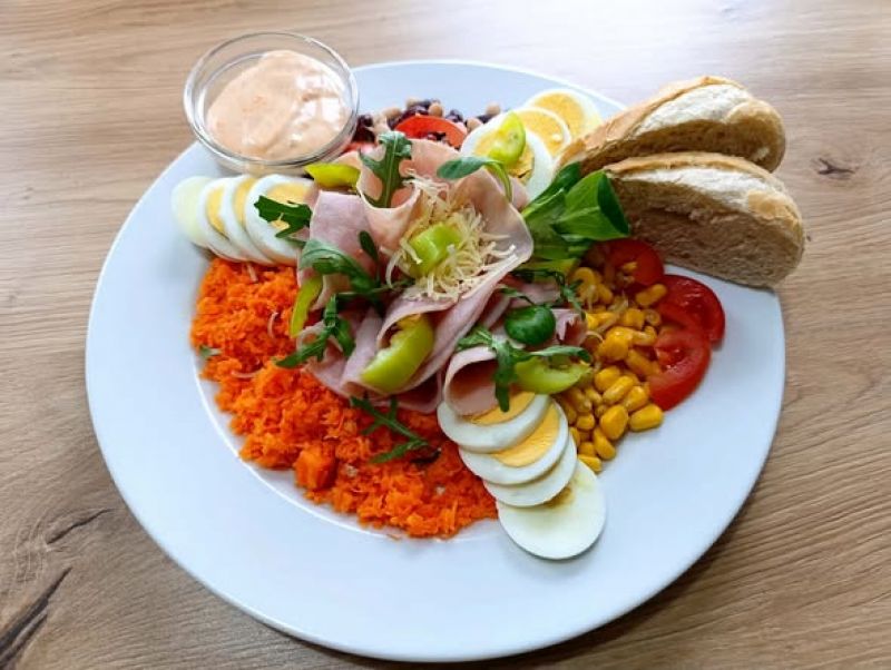 Kuřecí salát (300g - zelenina, kousky kuřecího masa, dresing a pizzabrot)