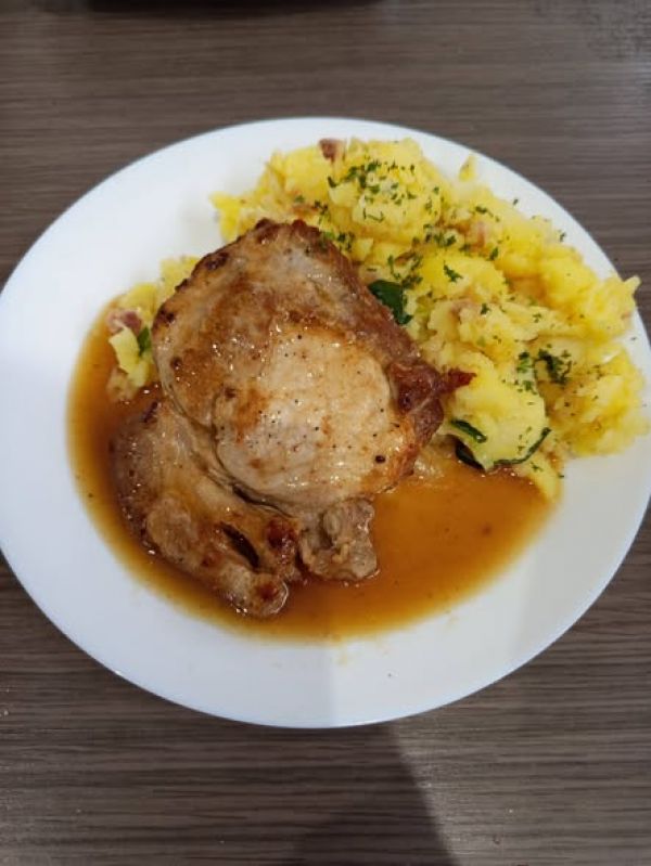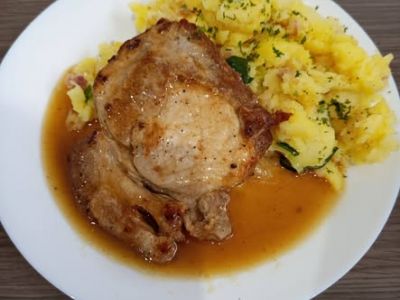 Marinovaná krkovice s vídeňskou cibulkou, americké brambory