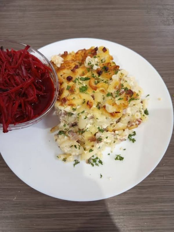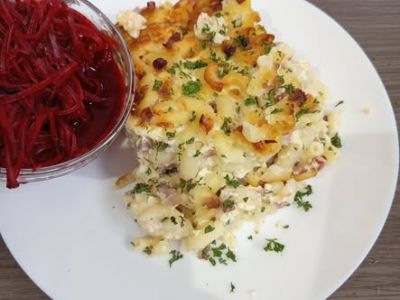 krémové gratinované brambory se zeleninou, žampiony a trochou šunky