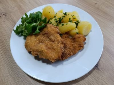 Řízek z vepřové kotletky (150g), vařený brambor/hranolky, salátek, tatarka