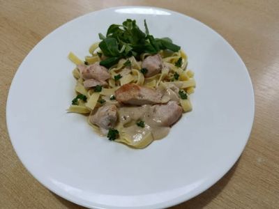 Tagliatelle s kuřecími kousky, baby špenátem, sušenými rajčaty, parmazán a microgreens