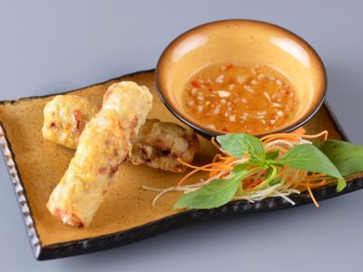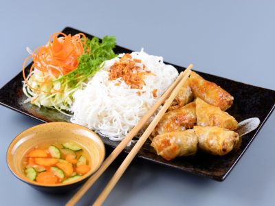 Tortilla plněná kuřecími stripsy s čerstvou zeleninou, bylinkový dresink, hranolky