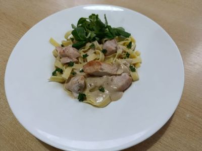 Vepřové nudličky s žampióny a smetanou (150g), rýže, salátek