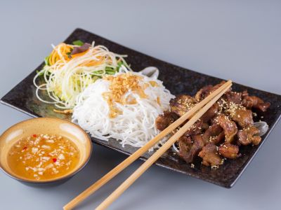 VEGAN- Asijský tofu se zelím, mrkví, pórkem, žampiony v hoisin omáčce, rýžové nudle *6